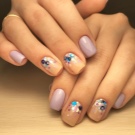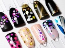 O notă deosebită este designul voluminos folosind „comorile japoneze” cu efectul picăturilor de rouă. Tehnologia de aplicare a „furtunii” nu va diferi de cele obișnuite. Principala regulă va fi o combinație de detalii deschise și întunecate într-o singură paletă de culori. Imediat ce stratul de bază ușor este uscat sub lampa UF, este necesar să lipiciți confetti pe gaura și pe părțile laterale (întunecate), să fixați detaliile cu finisajul și să le aruncați deasupra cercurilor, simulând o picătură de rouă. Contrastele din imagine vor ajuta la crearea unui confetti superficial. Folosiți aceeași paletă pentru cercurile drăguțe ca accesoriile din garderoba dvs.: brățări, genți, eșarfe, pandantive, pălării.
