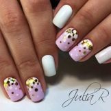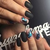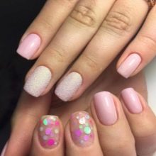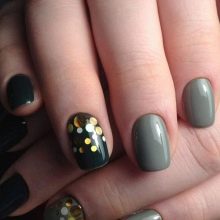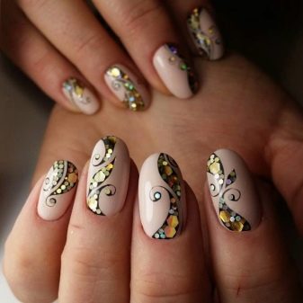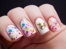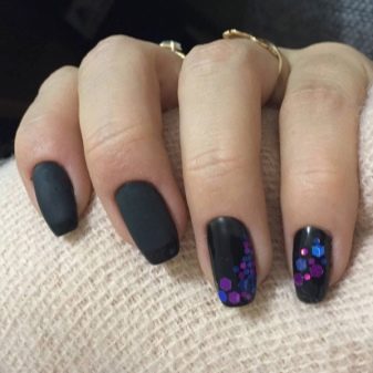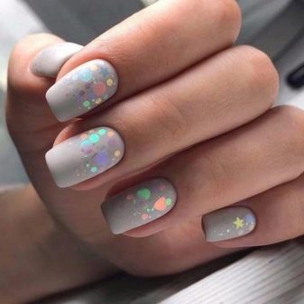 - Pentru o manichiură tematică, puteți combina o bază mată și confetti lucioși sau invers. Așa că obțineți unghii amuzante sub formă de gărgăriță, bucăți de brânză și chiar luna.