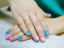 - Într-un design ombre, puteți alege o combinație de albastru pal și bej sau roz. Unghia de pe degetul inelar este decorată cu albastru strălucitor sau confetti în culoare fuchsia.