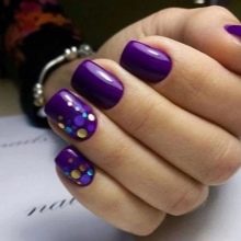 O opțiune universală și nesigur de atractivă este un ton luminos (prune, maro, roșu, albastru) și accente de aur, argint.Două unghii pot fi decorate cu glisiere sau pictură deschisă, iar pe deasupra unor astfel de imprimeuri se așază ușor kamifubuki pe tonul pigmentului principal. Modelul pe care îl alegeți la discreție.
