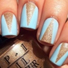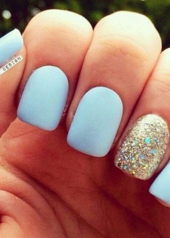 Unghiile albastre cu adăugarea de culori aurii și argintii arată deosebit de impresionant. Nu uitați însă că designul mat necesită o atenție deosebită, pentru că mai trebuie să luați în considerare combinația de texturi. De exemplu, unghiile mate de culoare albastră nu sunt destul de combinate cu o frecare de cameleon. Dar frecarea perlelor este mai mult decât adecvată.