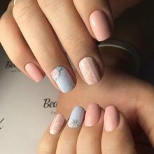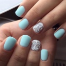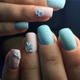 - De asemenea, puteți face ca culoarea albastră să nu fie primară, ci suplimentară. De exemplu, acoperă întreaga unghie cu lac bej sau roz deschis și creează un model folosind nuanțe de albastru mat. Această opțiune de design este perfectă pentru mirese, va ajuta la crearea unui aspect blând și cu adevărat aerisit, romantic.