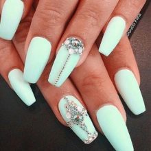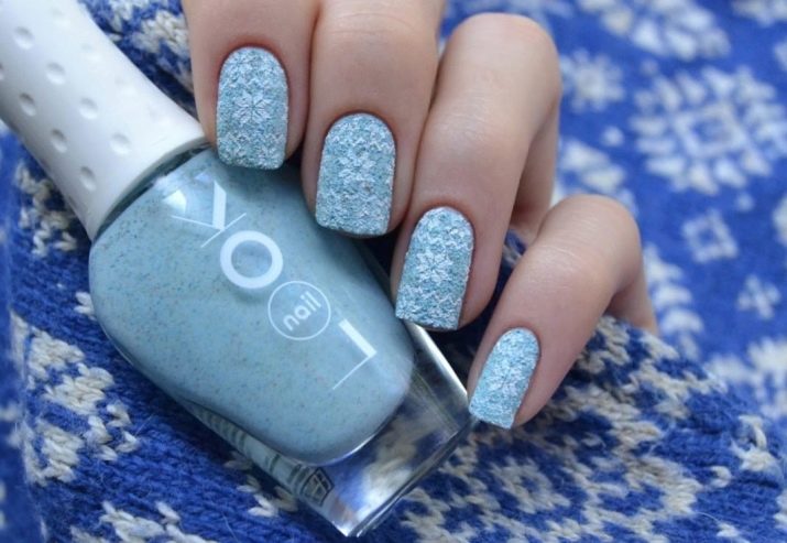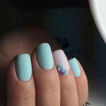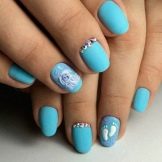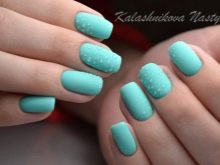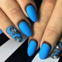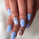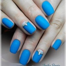 Manichiura albastru mat este autosuficientă, dar în același timp merge bine cu o varietate de decor. De exemplu, cu pietre de stras, paiete, modele volumetrice, frecare, modele. Doar nu uitați că totul este bun cu moderație. Și cu cât unghiile sunt mai scurte, cu atât ar trebui să existe bijuterii și desene.
