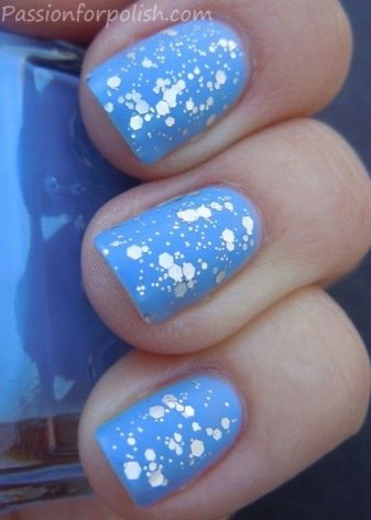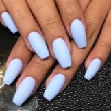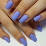 Un lac mat simplu în albastru nu va arăta niciodată plictisitor și inadecvat. Această umbră este relevantă în orice moment al anului: iarna este asociată cu fulgii de zăpadă și creează baza pentru picturi și imagini originale; vara, culoarea albastră seamănă cu cerul și marea. Spre deosebire de nuanțele întunecate, culoarea albastră dă imaginea moliciunii și feminității. Dar, în același timp, nu pare prea simplu.