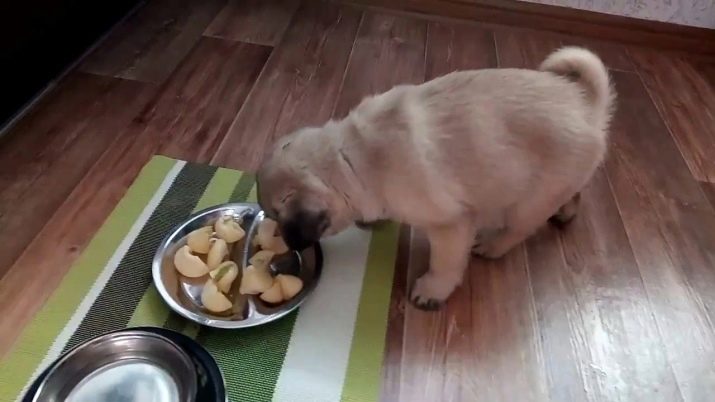 Unii pughiști mănâncă cu nerăbdare fructe - în acest caz, ar trebui să includă cu siguranță mâncarea preferată în meniu. O dată pe săptămână, câinilor trebuie să li se administreze brânză de căsuță sau chefir cu conținut scăzut de grăsime, precum și gălbenușul de pui.