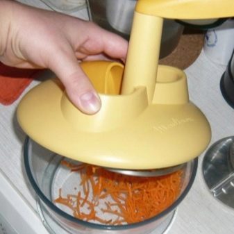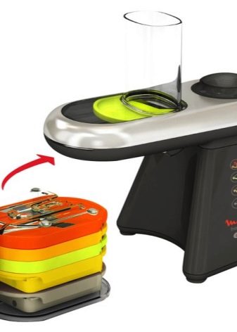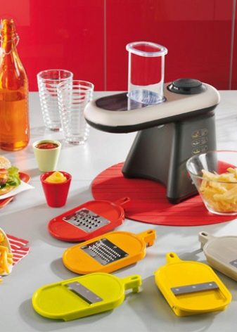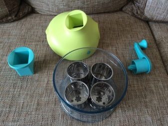 - Accesorii. Atenție la capacitatea de a scoate și înlocui lamele, dacă este necesar. Uneori, discurile se sparg sau devin plictisitoare, deci faceți cunoștință cu posibilitatea unei achiziții separate a elementelor de tăiere, astfel încât să nu fie necesar să schimbați întregul dispozitiv. Perfect dacă sunt prevăzute suplimentar containerele pentru produse mărunțite și depozitarea lamelor.