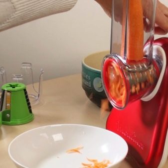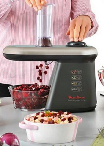 - View. În primul rând, este necesar să se determine tipul de produse achiziționate. Modelele manuale și mecanice vor fi o alegere excelentă pentru o familie mică, sunt ieftine, nu cheltuiesc electricitate și vă permit să tocați rapid legume sau fructe pentru salată pentru prânz. Cu toate acestea, atunci când tăiați, va face ceva efort. Aparatele electrice vor macina rapid orice produs, trebuie doar să apăsați un buton și să coborâți leguma într-un compartiment special.
