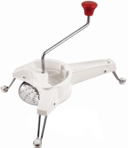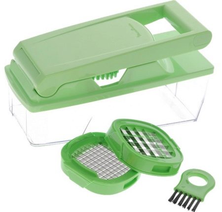 Cuțitul de legume manual este ușor de utilizat și fără pretenții în întreținere, poate fi spălat într-o mașină de spălat vase. Kitul include un recipient transparent, două duze de grătar, o perie mică pentru curățare ușoară și un capac. Cu acest dispozitiv, puteți tăia legumele și fructele în bucăți mari și mici.