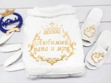 - cald. Nu încălziți-vă în proprietăți, ci în senzații și impresii. Cumpărați un halat de pământ și dați-l la atelierul de cusut pentru înscriere. Poate fi brodat cu fir auriu sau argintiu. Alege cuvinte care să-ți facă părintele să se simtă cald. De exemplu, sincer „Tată - ești cel mai bun!”, Cu umorul „Țar, doar un rege!”, Cu majestate „Regele inimii mele”.