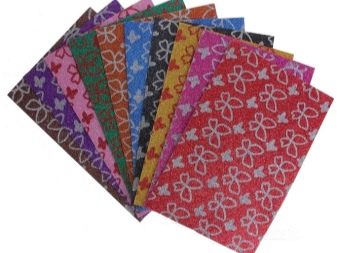 Materialul are o gamă largă de nuanțe. Există opțiuni cu imprimeuri - flori, forme geometrice, imagini. Este produs în formă simplă sau cu paiete (foamiran cu sclipici).