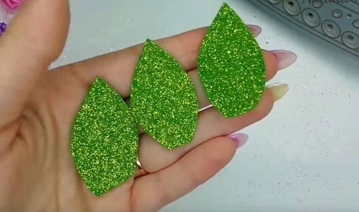 - 5 pliante de lungimi diferite sunt tăiate din foamiran verde. Încălzit și presat la matriță, care ar trebui să aibă o ușoară ușurare.