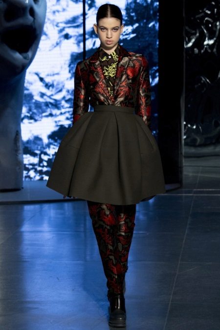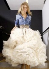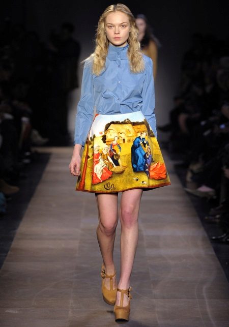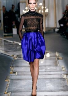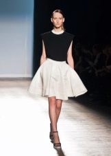 Creând imagini cu o astfel de fustă, ar trebui să ne amintim regula - cu cât este mai scurtă fusta pufoasă, cu atât mai modest ar trebui să fie potrivită cu ea. Și, prin urmare, cu o astfel de fustă, partea de sus arată perfect cu un suport, o „barcă” de gât îngrijită sau un guler.