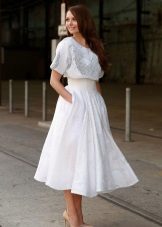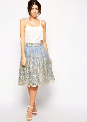 Fuste pufoase din guipure sau dantelă - elegante, feminine și foarte elegante. Adesea sunt prezentate în culori pastelate sau alb, iar în acest caz sunt combinate cu un top deschis și pantofi clasici.