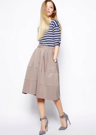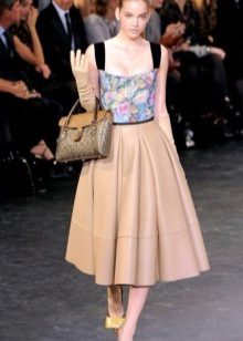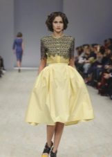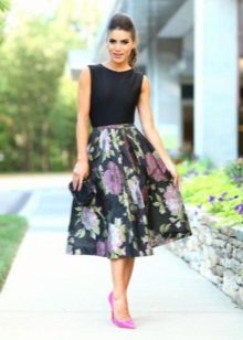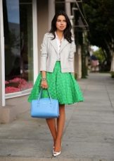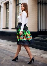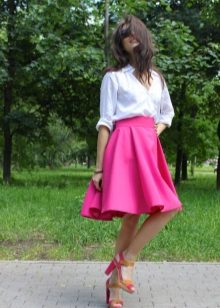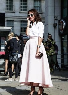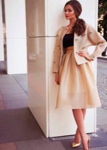 O fustă pufoasă de dimensiuni medii este numită universală, deoarece poate fi purtată atât la birou, la plimbare sau la o petrecere de modă. Dacă aceasta este o fustă strânsă pentru un aspect de afaceri, pentru aceasta este aleasă o geacă montată și pantofi clasici. Pentru opțiunea casual, topul trebuie să fie calm și discret.