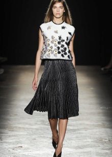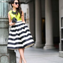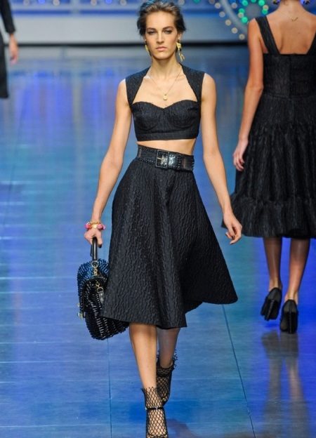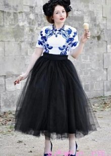 Cu o fustă atât de magnifică, creează atât un aspect clasic, cât și un business, precum și o ținută. Astfel de fuste arată bine cu un top contrast și discret. Blaturile albe și gri, precum și cremă, lapte și alte culori pastelate se potrivesc bine unei fuste cu volum negru. De asemenea, o astfel de fustă poate fi combinată cu un top negru.