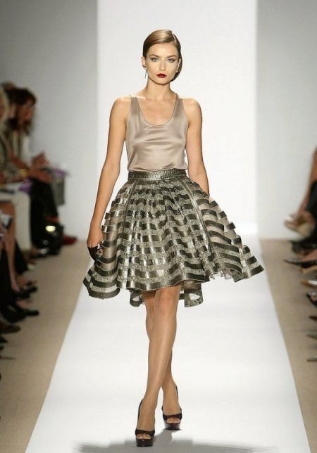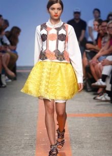 Lungimea modelelor magnifice pentru sezonul de vară este reprezentată atât de fuste mini, cât și de produse de podea. În timpul verii, fustele pufoase sunt combinate cu un tricou, un blat strâns pe curele, o bluză sau o cămașă.