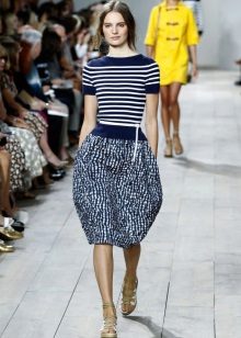 Un top voluminos întins este purtat mai rar cu o fustă plină, dar pentru unele fete ansamblurile cu bluze delicate sau blaturi voluminoase sunt foarte potrivite, în special în combinație cu o centură din material textil sau din piele. O idee bună este un produs în care partea superioară este voluminoasă, iar partea inferioară se potrivește strâns în jurul taliei. Combinând un astfel de top cu o fustă completă, obțineți o siluetă feminină armonioasă.