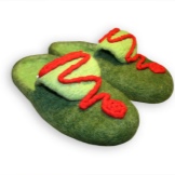 - dvojvrstvové papuče z plsti kontrastných farieb. V tomto prípade má horná vrstva kučeravé drážky, čím vytvára zaujímavý vzor. Tu sú napríklad plstené papuče štylizované ako dobre známe topánky Crocs.