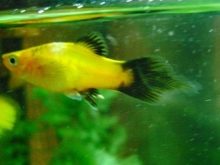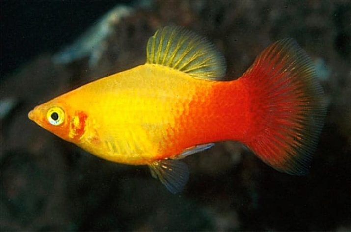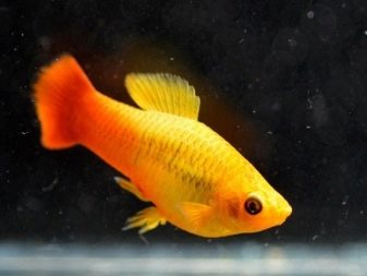 - Жута. Сунчана риба са жутим трбухом и светлим гримизним репом. Код женки репна пераја може бити само благо обојена. Ова Пецилија је непретенциозан, другачије живахног и духовитог карактера.