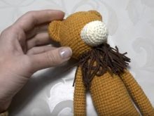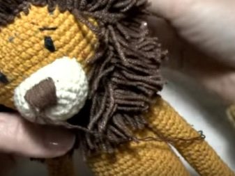 На крају је потребно везати реп лава. Прво би требало да назовете 15 ваздушних петљи исте жуте боје. Конац је уредно обрезан, али истовремено требате оставити мали крај нити да бисте га даље шивали до преосталих делова. Припремите десет комада пређе од теракотске пређе унапред. Њихова дужина треба да буде осам центиметара. Треба их савити на пола и узети куку већег пречника (4 или 5 милиметара).Кроз прву петљу утакните ланац и причврстите га. Четкицу треба мало исећи.