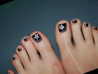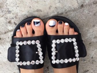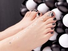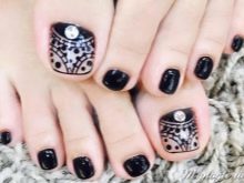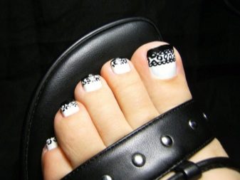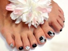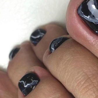 - Ако говоримо о најпопуларнијим верзијама црно-бијеле педикуре, тада се истиче мраморни дизајн. Имитација белог или црног камена са удубљењима врши се једноставно помоћу игле. Вреди рећи да је ово прилично млада техника дизајна. Главна боја наноси се на нокат, на фолији се мешају црно-бели лакови, а на још сувој површини црте се иглама.