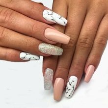 - Деликатна маникура у нијансама нијанси такође се може разриједити бијелим „мраморним“ ноктима, а мали сребрни трагови додаће милост прстима. Ова опција је погодна за свакодневно ношење.