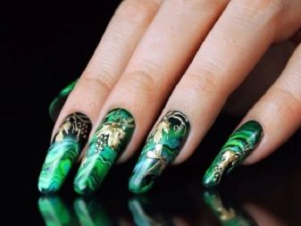 - Маникура од малахита у комбинацији са златним цртежима такође ће бити одлична опција за вече.