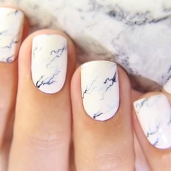"Мраморна" маникура је мрља од танких линија од неколико нијанси, које се беспрекорно замењују једна другу. Лепота таквог маникира је што је исти дизајн готово немогуће набавити, па ће ваши нокти увек бити индивидуални. Класична верзија је бела позадина и сиво-црне вене.