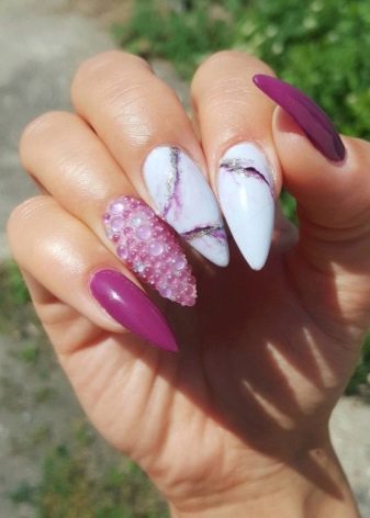 - Класични "мермерни" нокти на пару прстију могу умирити претерано допадљив маникир с пуно рхинестона, бујонима и сјајем.