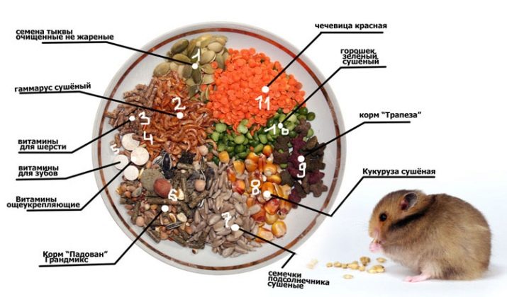 Јеловник глодара би требало да буде уравнотежен и разнолик, најчешће узгајивачи радије користе специјализовану храну за храњење патуљака хрчака. Међутим, поред мешавине, у исхрану кућног љубимца треба да буде укључена и свежа храна. То могу бити тиквице, краставац, кукуруз, шаргарепа. Од слатких сезонских бобица и воћа, глодари могу понудити банане, јабуке, крушке, грожђе.