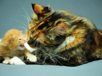 - Тробојне мачке - одлични ловци, прелепе мајкето ће лизати не само мачића и бебу. Увек су спремни да бране власника, умерено радознали, способни да постоје и са другим животињама, помало попустљиви околности.