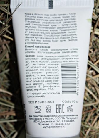 - Дневна тоничка крема за кожу око очију. Активни састојци першуна и лимунске траве деликатно његују њежну кожу око очију, смањујући врећице и тамне кругове испод њих. Мекана текстура креме брзо се упија у кожу и тонира је.