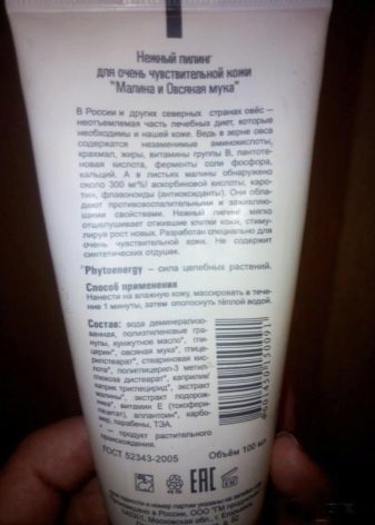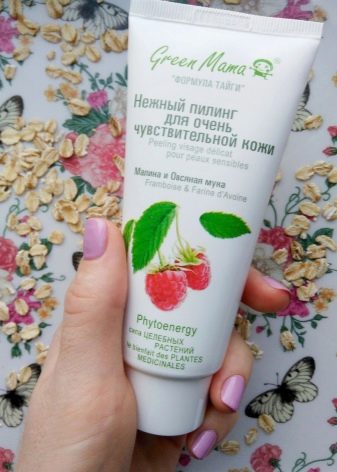 - Њежан пилинг лица на бази малина и зобене каше. Идеалан је за осјетљиву кожу, јер се текстура производа састоји од врло ситних честица које њежно чисте кожу без оштећења.Производ има благ мирис овсене каше, савршено храни, матира и освежава кожу. Алат је прилично економичан: за један поступак, који би требало да се обавља не више од 2 пута недељно, довољан је само један мали грашак.