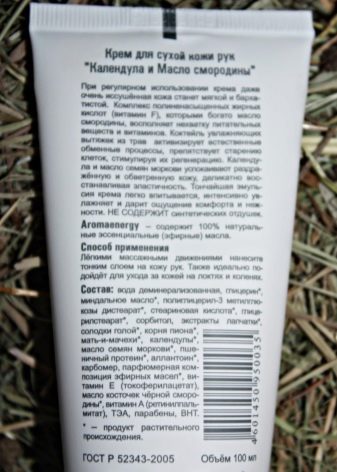 - Крема за суву кожу руку на бази уља календуле и рибизле. Овај производ активно негује и дубоко влажи руке. Брзо враћа иритирану кожу, еластичност, подстиче активну регенерацију коже и успорава процес старења ћелија.