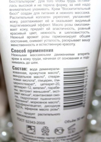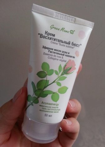 - Крема "Предивно попрсје." Садржи есенцијално уље руже, које ствара подмлађујући ефекат коже, враћајући јој еластичност и здраву боју. Уље не само да негује кожу, већ је чини меком и свиленкастом. Приметно заглађивање коже настаје захваљујући биљном колагену, који је чини глатком и еластичном.
