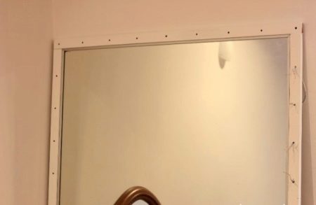 - Израда оквира огледала за визуеле. Потребне ће бити две шипке од дрва (можете одабрати други материјал, али дрво је поузданије и лако се монтира и демонтира), које се секу по величини огледала. Пиљење шипки је потребно тако да њихови крајеви буду 45 степени. Добијене делове треба пажљиво обрадити брусним папиром како би њихова површина била глатка. Ради поузданости, огледало се може монтирати у оквир помоћу индустријске траке.