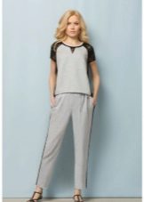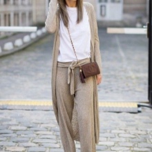 Плетено одијело за хлаче треба разриједити с типично женским елементима одјеће (блузе, врхови с чипком) и додацима (накит, елегантна торба и ципеле). У зависности од жељене оријентације слике - романтичније или, обрнуто, подебљане - ови детаљи могу бити мање или више.