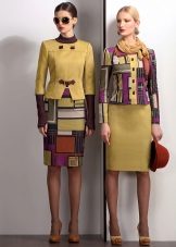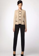 Врло елегантна канцеларијска опција је кратка уска јакна и класична сукња од оловке. Шаре боја комплета су изграђене на комбинацији беж и дубоке браон боје (сукња одјекује у боји са траком јакне и завршетком џепова). Јакна је украшена допадљивим дугмићима. Добро одабране панталоне, торба и елегантне ципеле с високом петом.