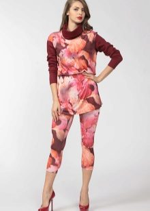 Шармантни панталоне у богатој бордо нијанси - мајица са женским деколтеом "чамац" и уске панталоне. Врхунац костима је елегантан цветни принт.