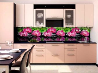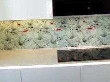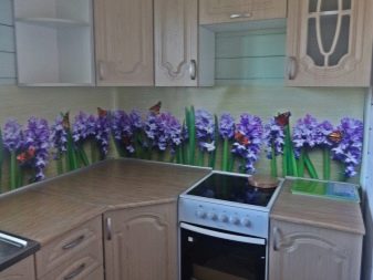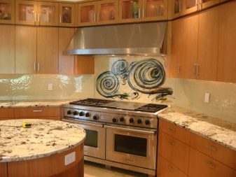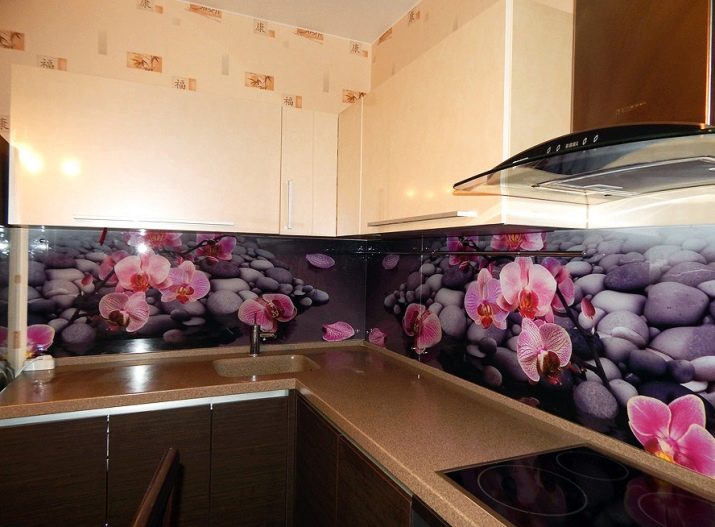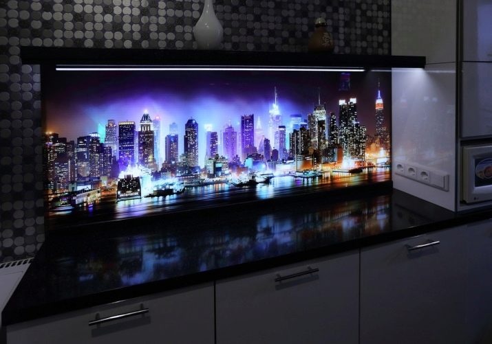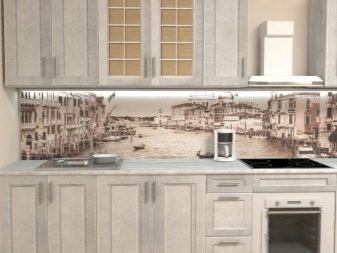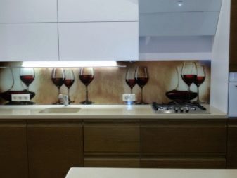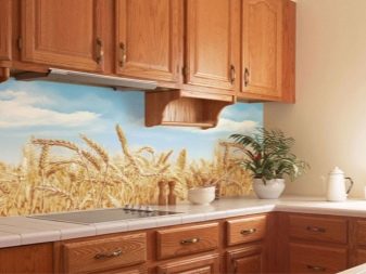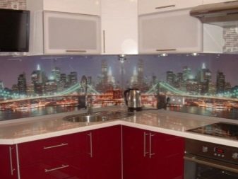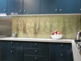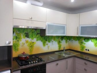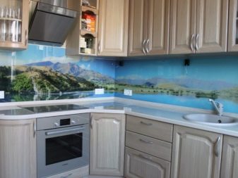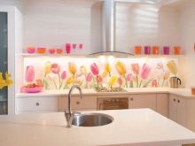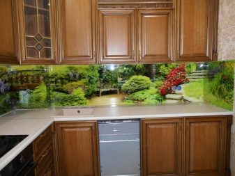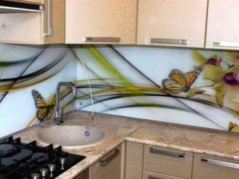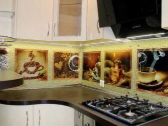 - Стаклени премаз са фото штампом - најпопуларнија опција, која је у стању да украси било коју собу. Употреба савремене опреме омогућава вам да на стражњу страну панела направите и залепите различите слике које визуелно могу проширити и најмањи кухињски простор.
