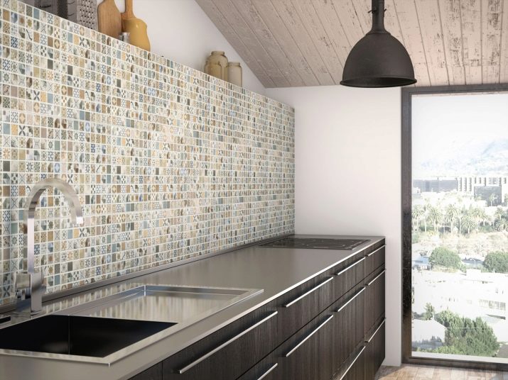 - Мозаик апликација - Савремени правац, који из године у годину постаје све популарнији. У овом премазу можете комбиновати једну, две или више боја. Предности - лакоћа одржавања, употреба минималног броја алата, могућност комбиновања са другим завршним материјалима. Слаба тачка је присуство великог броја спојева плочица.