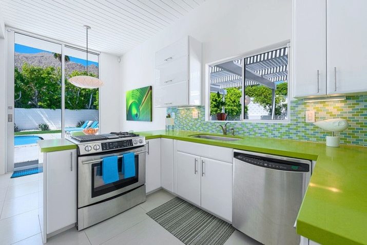 - Светле и богате боје на позадини беле кухиње увек су тражене и релевантне. Поготово ако је изабран зелени тон (слика 2).
