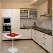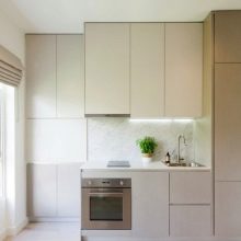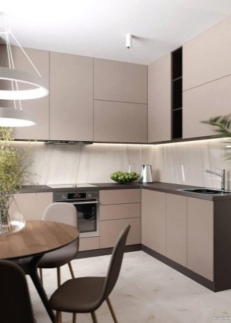 - Минимализам стил. Име већ говори само за себе. У овом стилу нема ништа сувишно. Кухиња, која је дизајнирана у стилу минимализма, обично укључује све што је најпотребније. Максимална функционалност са најмање непотребних делова и додатака. Недостају било какви украсни детаљи који могу преоптеретити унутрашњост мале собе. Обично се користе пригушене боје са минимално светлим акцентима. Техника је уграђена.