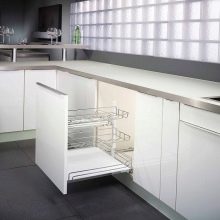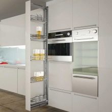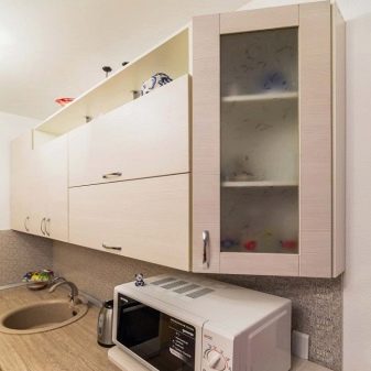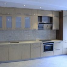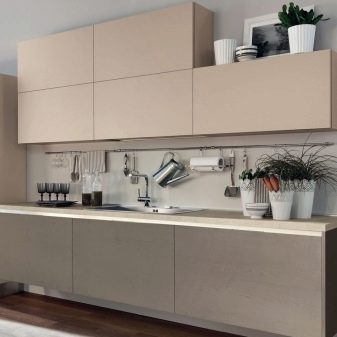 - Горњи ормарићи кухињског сета најбоље су урађени испод стропа. Тако можете уштедети много простора, а осим тога, они ће служити као одлично место за одлагање кухињске опреме.