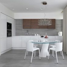Стол ће, наравно, морати да бира не баш велики, обично за 2-4 особе. Најбоље је дати предност сјајним опцијама или стаклу. Стаклени столови су врло повољни у малим кухињама, посебно у тандему са акрилним столицама.