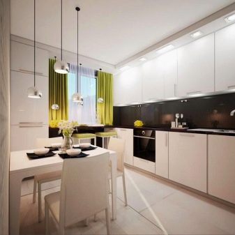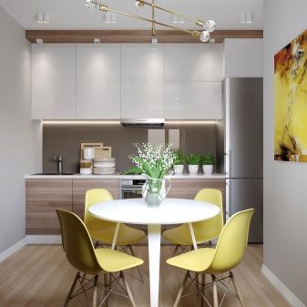- Ако је кухиња у кухињи 9 квадратних метара. м. рађене у неутралним бојама, нагласак је најбоље ставити на свијетли текстил. Дакле, ако је сет сив, онда су лимунске меке столице са белим столом саврсене за то.