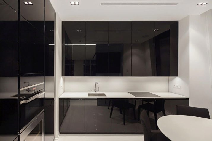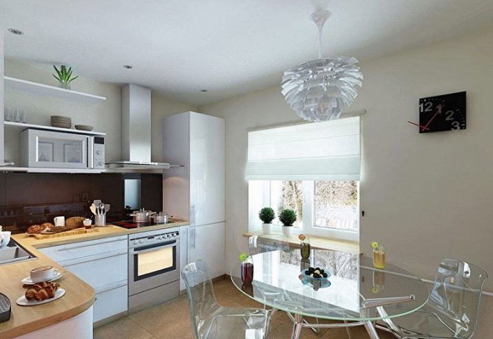 - У малим кухињама сјајни протежући плафони са рефлекторима изгледају сјајно. Велики лустери по правилу су неприкладни у модерној унутрашњости тако мале собе, јер визуелно скривају простор, мада много тога зависи од дизајна у целини.