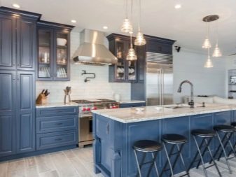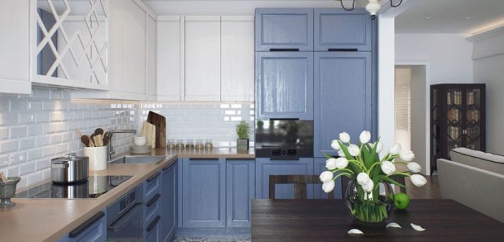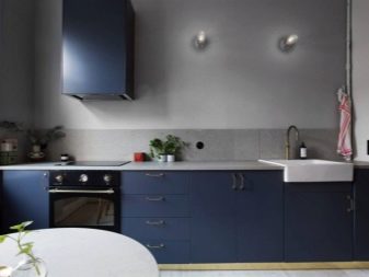 Активан, племенито плав (мало са примесом ретро), освежавајући бели простор (ормарићи и прегача) и сива радна плоча - врло леп и елегантан сет. Подршка сиве боје у овој унутрашњости може се наћи у декорацији пода.