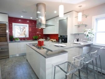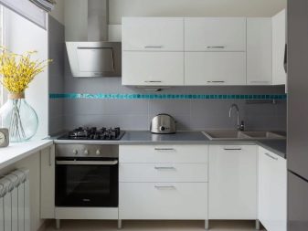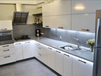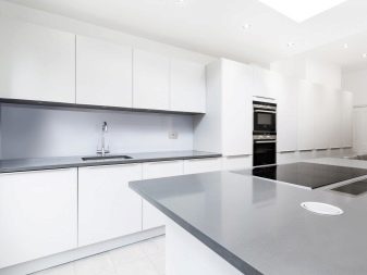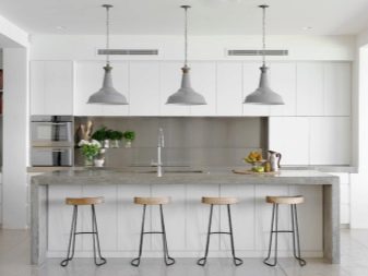 Још једно прилично популарно решење за уређење кухиње. Фасаде висећих ормана (и можда цео случај) су направљене у искључиво белој боји. Без штампања, без посебне текстуре, без прскања. Сјајна класична кухиња са јасном геометријом у минималистичком стилу.