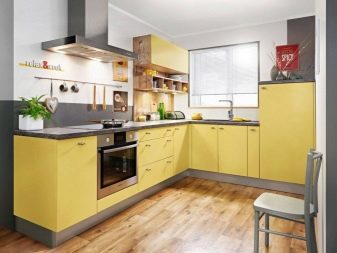 Сиви доњи ормарићи и сива радна површина - прелепи су, сезонски, смирени. Али горњи жути ормарићи су динамични, сунчани, забавни. Заједно, добија се дивна формула за угодну и топлу собу, која ће постати тачка привлачности за сва домаћинства.